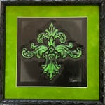 This striking artwork presents an ornate design that harmonizes bold green accents against a deep black background. The intricate detailing of the central motif draws the eye, showcasing a blend of elegance and modern flair. Framed in a textured black border, the piece is further enhanced by a vibrant green mat, creating a captivating contrast that energizes any space. Ideal for those looking to add a touch of sophistication and color to their decor, this artwork is a perfect addition to elevate your interior aesthetic.